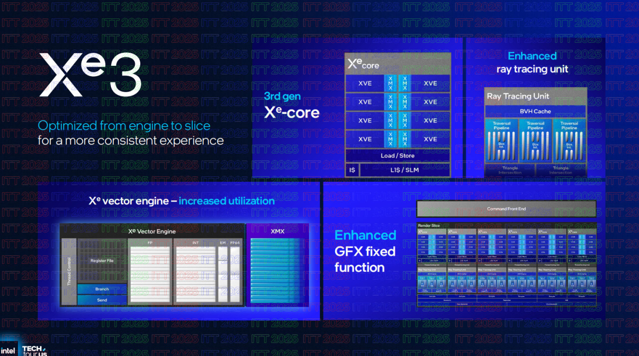 GPU:AI与游戏的全新大脑而在GPU方面,Panther Lake则是搭载了全新的Xe3锐炬核显(代号Celestial),这是Intel第3代Xe架构图形单元的首次亮相。与上一代Xe2 (Battlemage)相比,Xe3在架构上进行了大幅升级,核心数量和频率上限都有所提高。