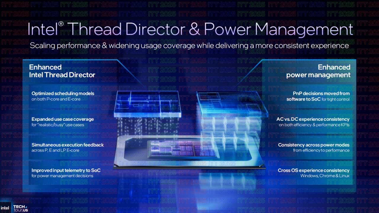 此外,Panther Lake还带来了新升级的Intel Thread Director线程调度技术,通过硬件监测和AI算法,能更精细地识别当前运行的负载性质,将线程智能分配给性能核、效率核甚至NPU等最适合的单元执行。