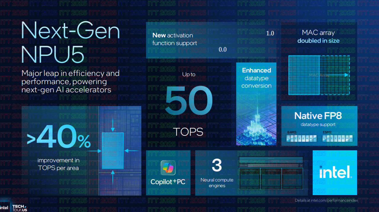 PU:让AI随时在线最后我们来聊聊NPU,作为新生代处理器的重要组成部分,Panther Lake的第五代NPU在算力上有了非常大的提升,最高可达50 TOPS,虽然对比GPU的算力来看并不高,但是也已经是前代的数倍。